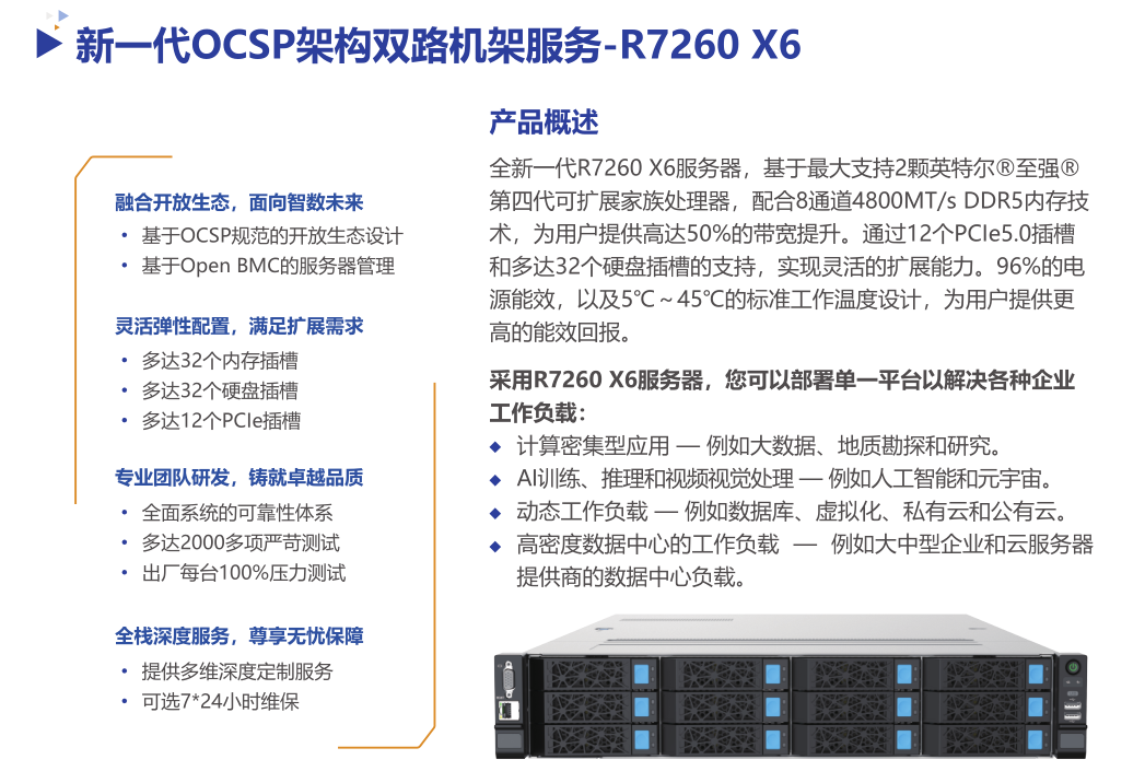 Xizihu and Qianjiangchao are 2U universal servers developed based on Intel OCSP standards. They support intelligent lifecycle management and can be flexibly configured on demand to meet application scenarios such as high performance computing, virtualization, AI, and database. Based on Yunjian IDMS (Integrated R&D Manufacturing and Service) integration capabilities and more open strategies, it can meet customers' diversified agile customization needs from hardware to software (BMC&BIOS, etc.), from L3 to L12.