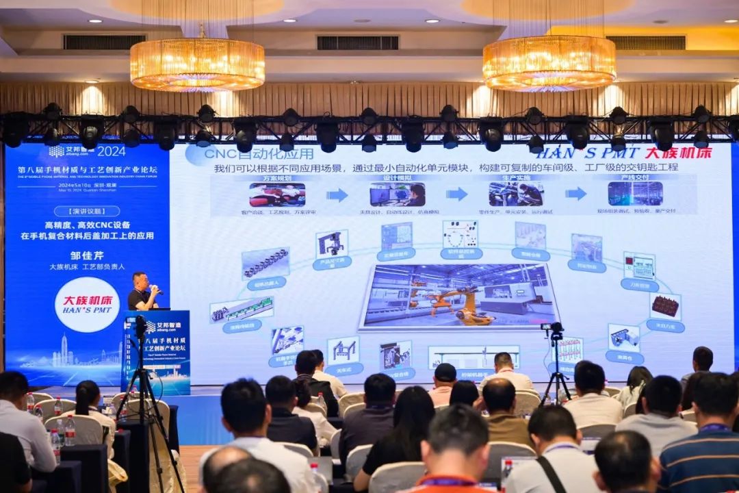 5月10日,第八屆手機材質與工藝創新產業論壇于深圳觀瀾格蘭云天酒店成功舉辦,來自國內外知名ODM/OEM等手機終端廠商,手機蓋板、轉軸、折疊屏屏幕模組等加工廠商及其他3C上下游相關材料、設備廠商,高校及研究院所等共240多名行業大咖、技術專家等參與此次論壇。大族機床受邀參與,與在座人士共同探討3C行業發展趨勢,交流分享3C材料加工技術和工藝應用。