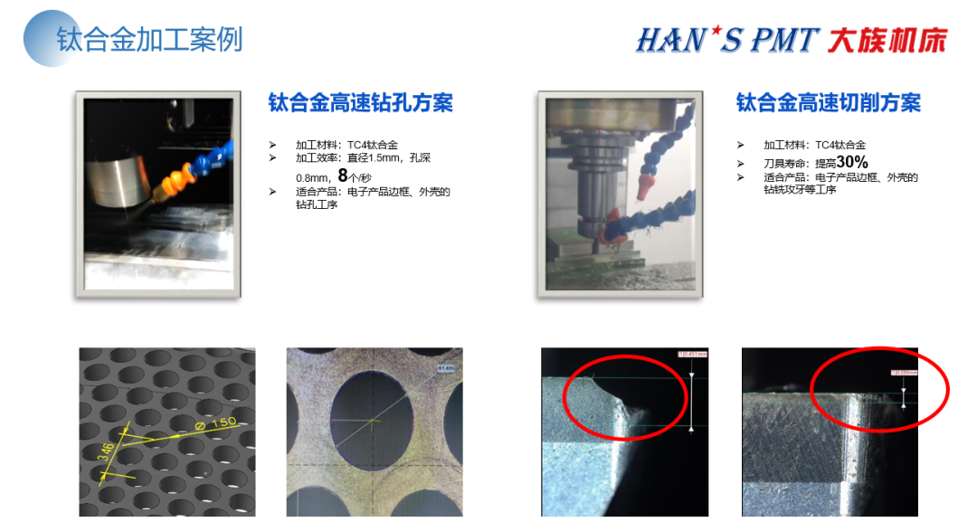 鄒工還重點講解了大族機床在鈦合金等熱點材料上的最新研究成果,鈦合金的加工良率和效率是目前3C廠商最大的痛點和難題之一,大族機床在鈦合金制程工藝上積極探索和研究,在CNC機型選擇、主軸和刀柄選型、刀具選型設計、結構設計、加工方式等配置和設計上反復測試和驗證,結合切削液冷卻優化、自適應控制技術、刀具檢測及其他輔助工具等功能設置和優化,對于典型難加工材料——鈦合金等工業零部件,可實現較為高效、成熟的數控加工解決方案,并已成功實現量產。