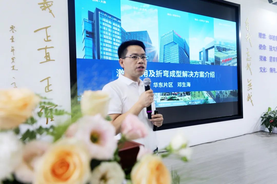 大族激光智能裝備集團華東銷售片區負責人鄧生海作“激光應用及折彎成型解決方案”的主題演講。鄧總介紹了大族激光的整體概況、業務與產品,以及大族激光智能裝備集團的多工廠布局、“切割+”“智能+”全系產品,和部分客戶應用案例。鄧總還介紹,大族激光智能裝備集團產品已實現從平板切割、管材切割、型材切割、卷料切割,到復雜曲面的三維五軸激光切割,再到坡口切割、封頭切割等特殊切割工藝的全面覆蓋;“智能+”系列解決方案從單機產品擴展到自動化、智能化產線,再到大型智能化工廠,為工程機械、電梯制造、汽車制造等行業知名客戶提供了數百套智能化、自動化生產解決方案。
