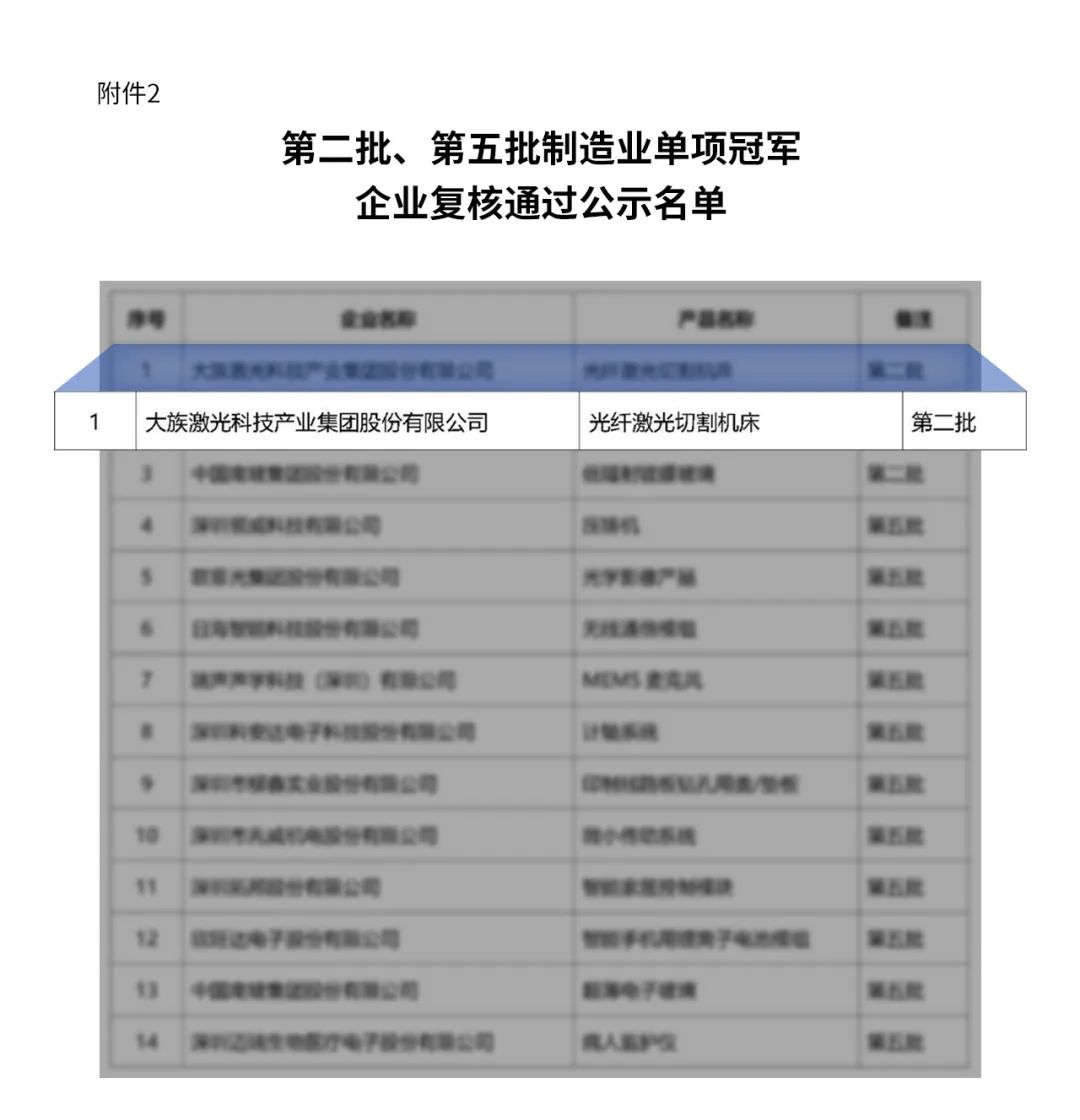 近日,深圳市工業和信息化局發布《關于第八批制造業單項冠軍企業和通過復核的第二批第五批制造業單項冠軍企業名單的公示(深圳市)》,大族激光又一次通過審核,光纖激光切割機床入選國家級“制造業單項冠軍企業”公示名單。這是大族激光連續三屆(2018年-2020年、2021年-2023年、2024年-2026年)獲評制造業單項冠軍(產品)認定。