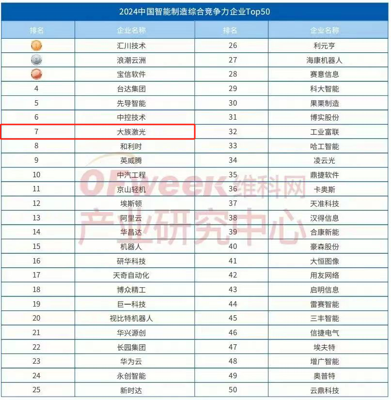 此外,維科網產業研究中心每年會評選出各細分行業的核心廠商名單附在藍皮書內。其中,大族激光入選2024中國智能制造綜合競爭力企業Top50,位列第7,突顯企業實力和品牌影響力。