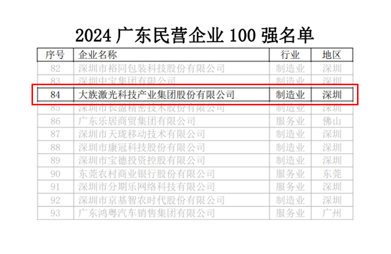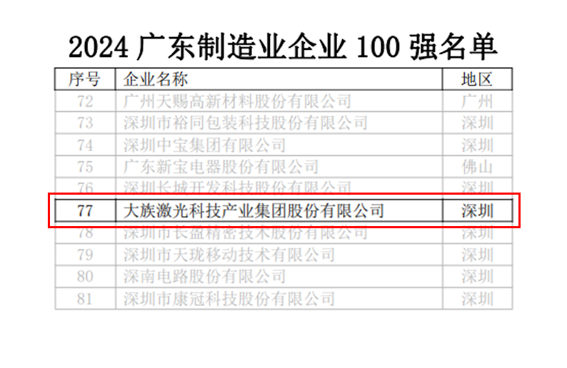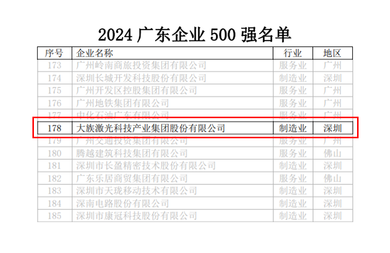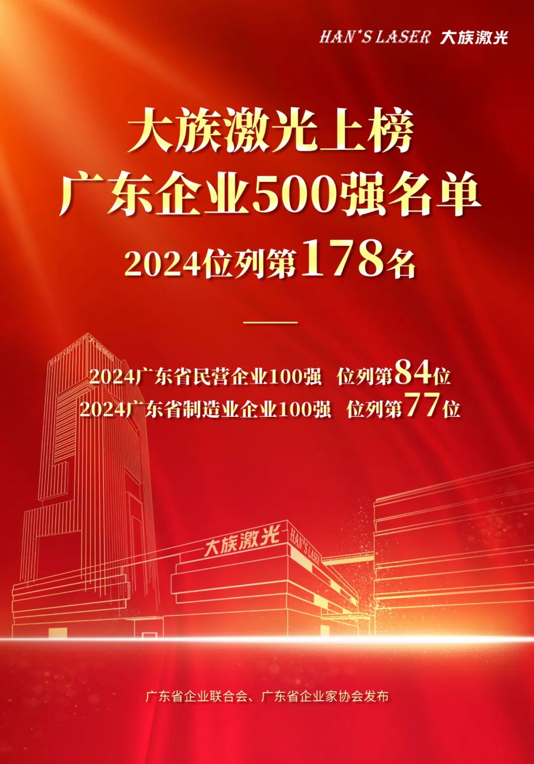 近日,廣東省企業聯合會、廣東省企業家協會連續第19年發布2024廣東500強企業榜單及發展報告(下稱《報告》),“2024廣東民營企業100強榜單”、“2024廣東制造業企業100強榜單”相繼發布,大族激光憑借優越的綜合實力和穩健表現,榮登廣東企業500強榜單;同時上榜2024廣東省民營企業100強和廣東省制造業企業100強,分別位列84名、77名。