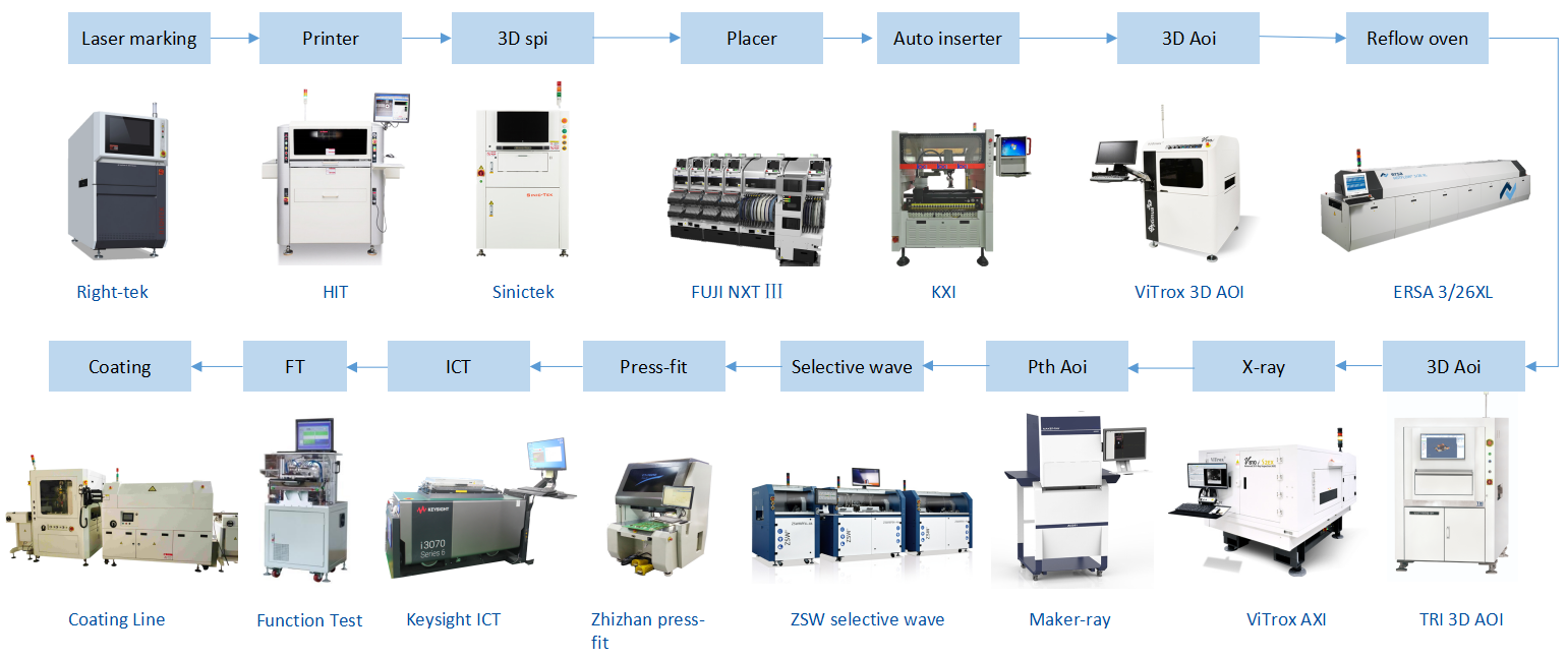| 測試 | 單板工藝 | 全線配置 SPI、爐前AOI、爐后3D AOI、AXI | |